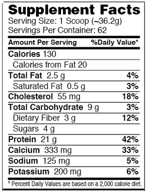 Integratore alimentare a base di proteine ad alto contenuto di fibre, con edulcoranti. In polvere.